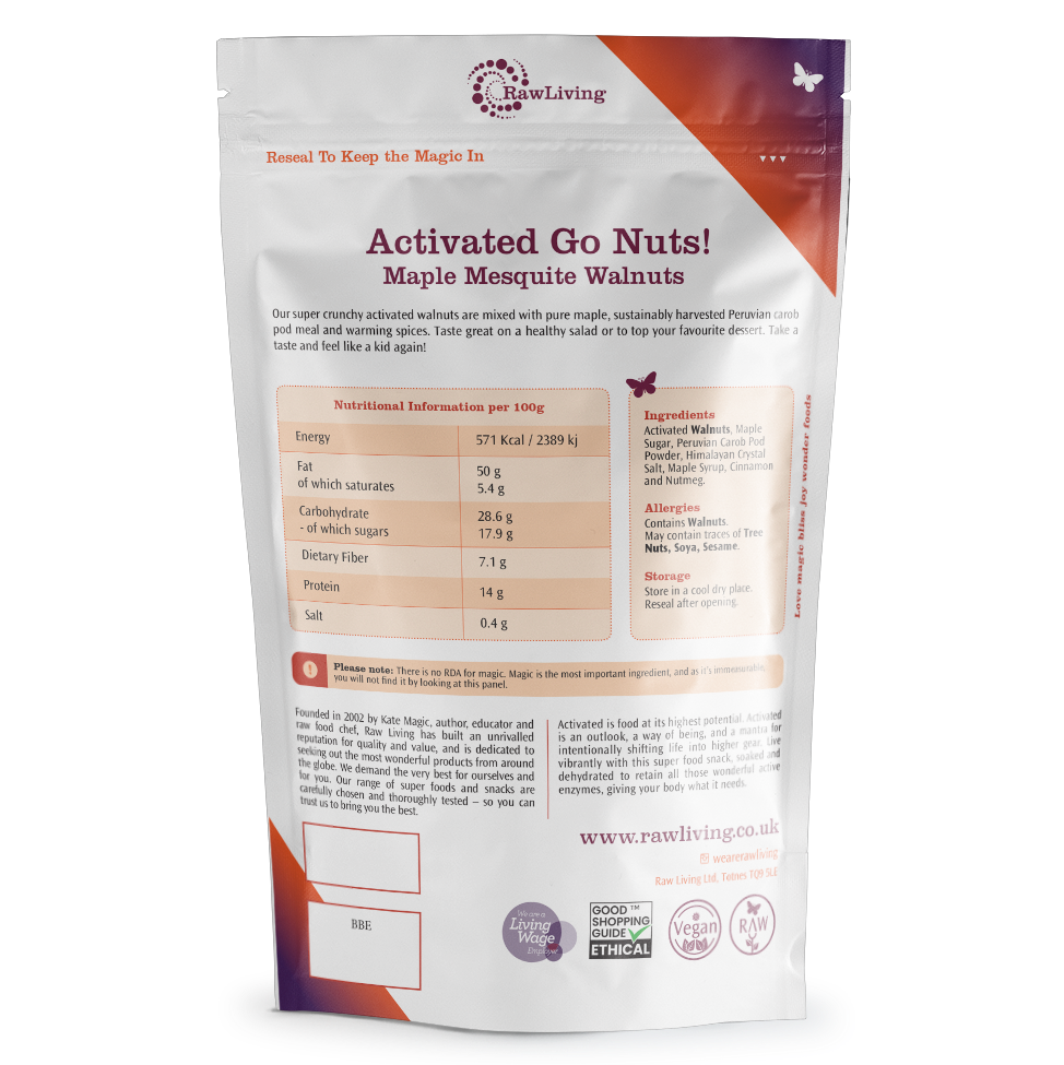 Our super crunchy activated walnuts are mixed with pure maple, sustainably harvested Peruvian carob pod meal and warming spices. Taste great on a healthy salad or to top your favourite dessert. Take a taste and feel like a kid again!