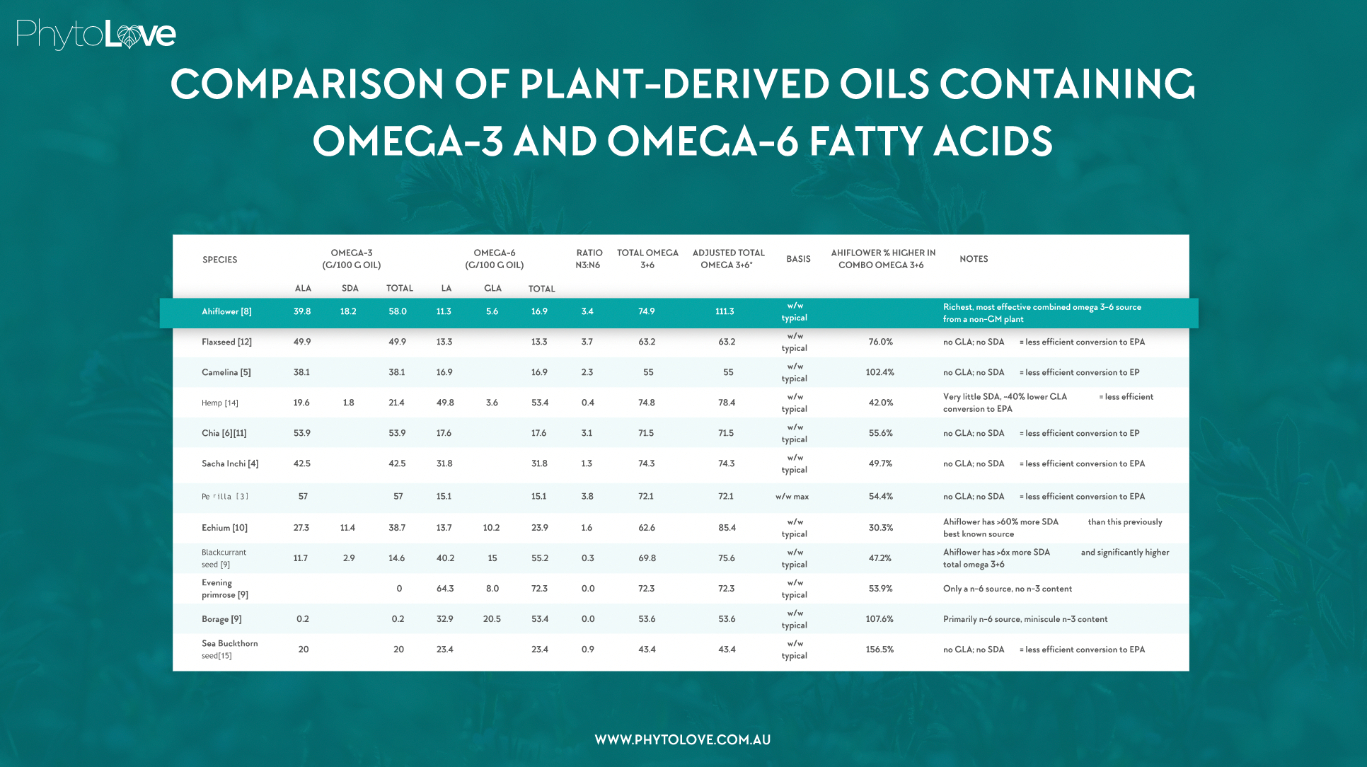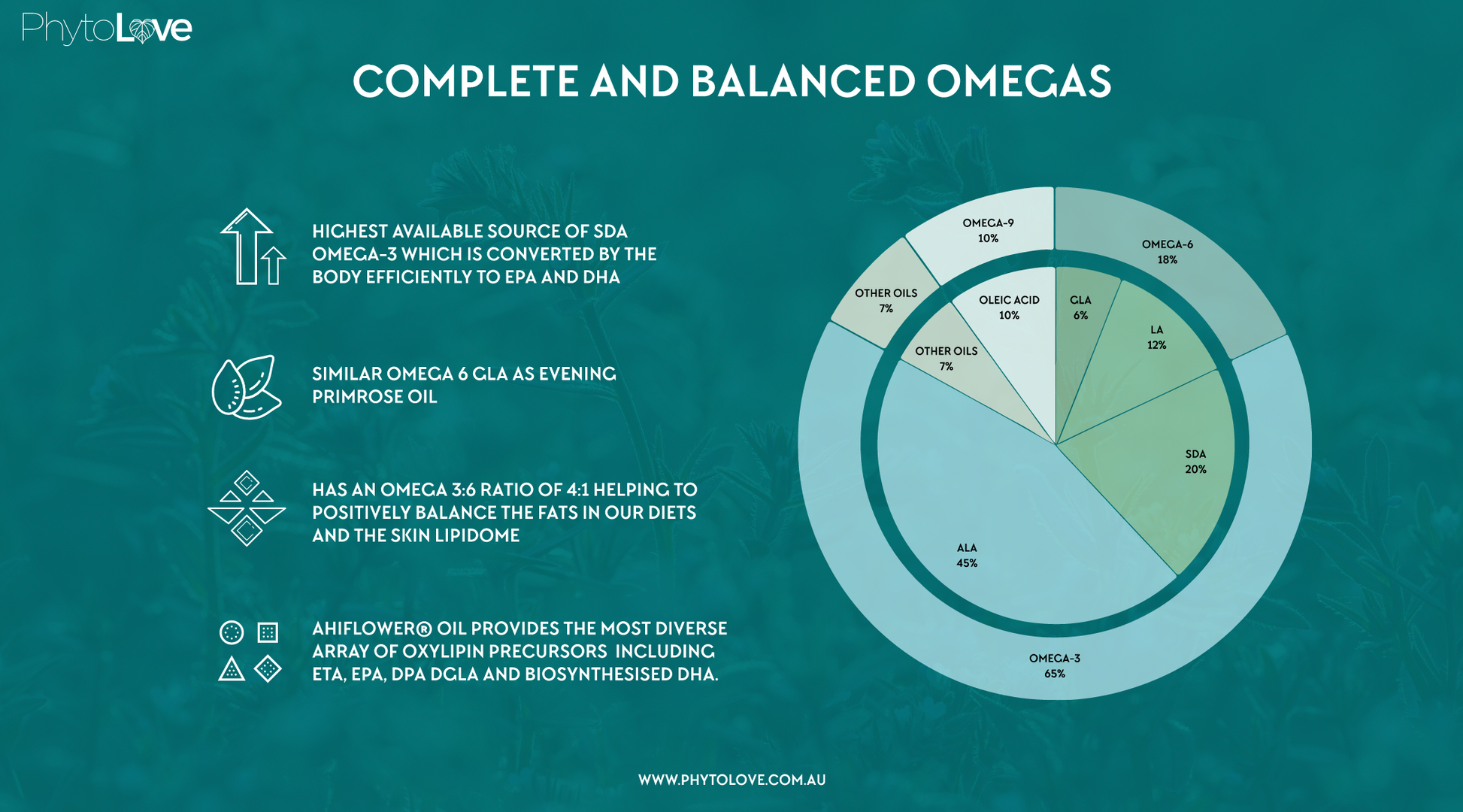 Imagine an oil that provides or readily converts in the body to the health-boosting omegas found in flax, chia, fish, algae, hemp, evening primrose, and olive oil, rolled into one! Ahiflower offers a complete and balanced plant-based omega profile, like no other oil available.