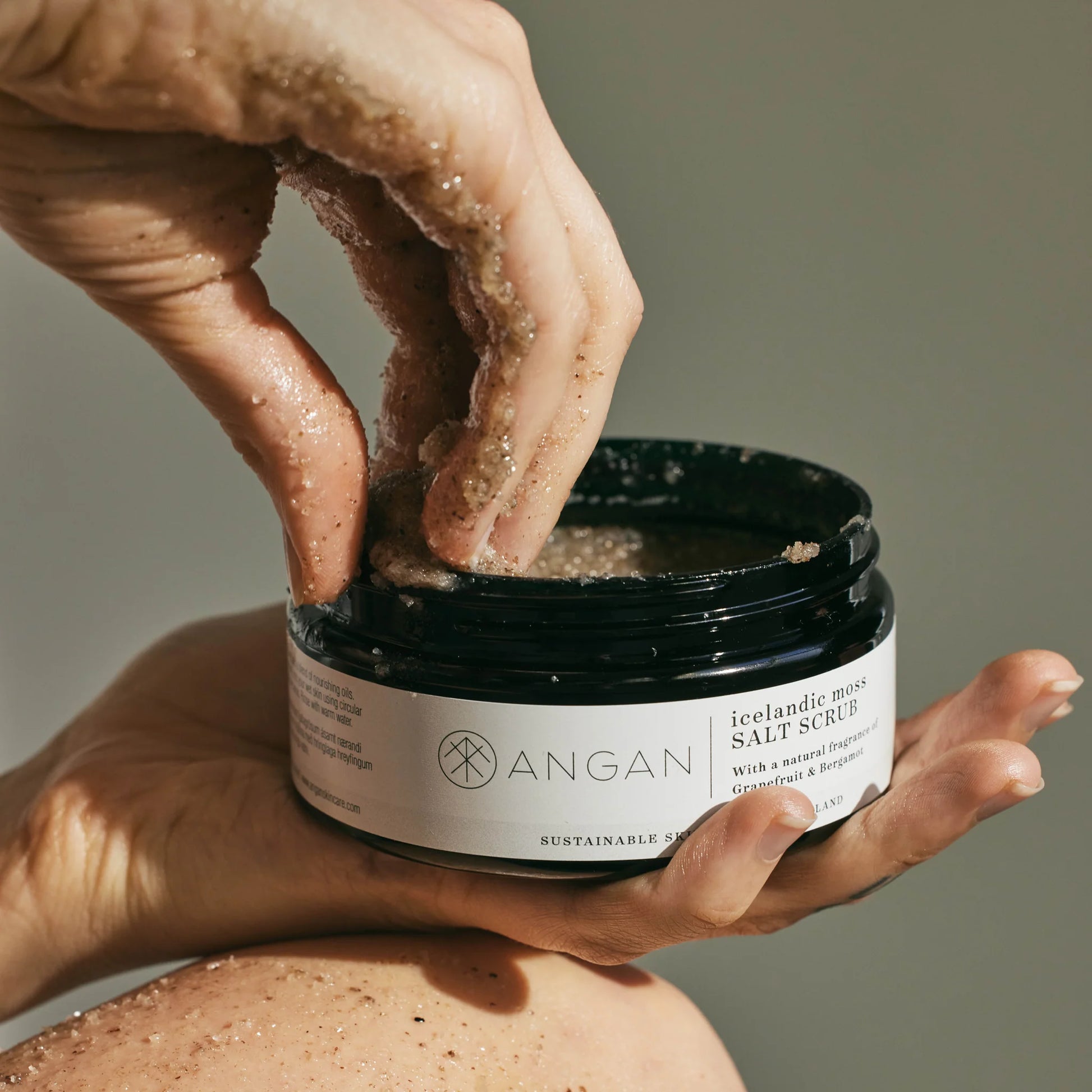 Exfoliating mineral rich salt scrub with handpicked Icelandic moss and a blend of nourishing and regenerative oils leaving the skin feeling soft and energized. With fresh citrus scent from therapeutic essential oils of Grapefruit and Bergamot.