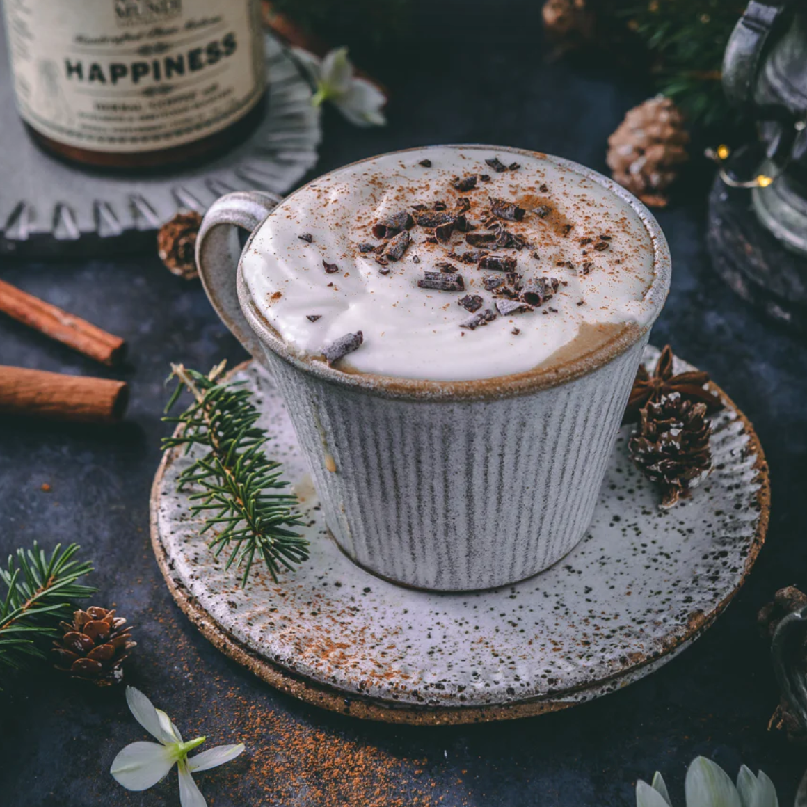 And to top it all off, we combined these happy herbs with coffee-esque bases for their grounding and exquisite flavors, such as roasted Dandelion, roasted Chicory, Maca, Lucuma, Burdock, Mesquite and real organic Vanilla.