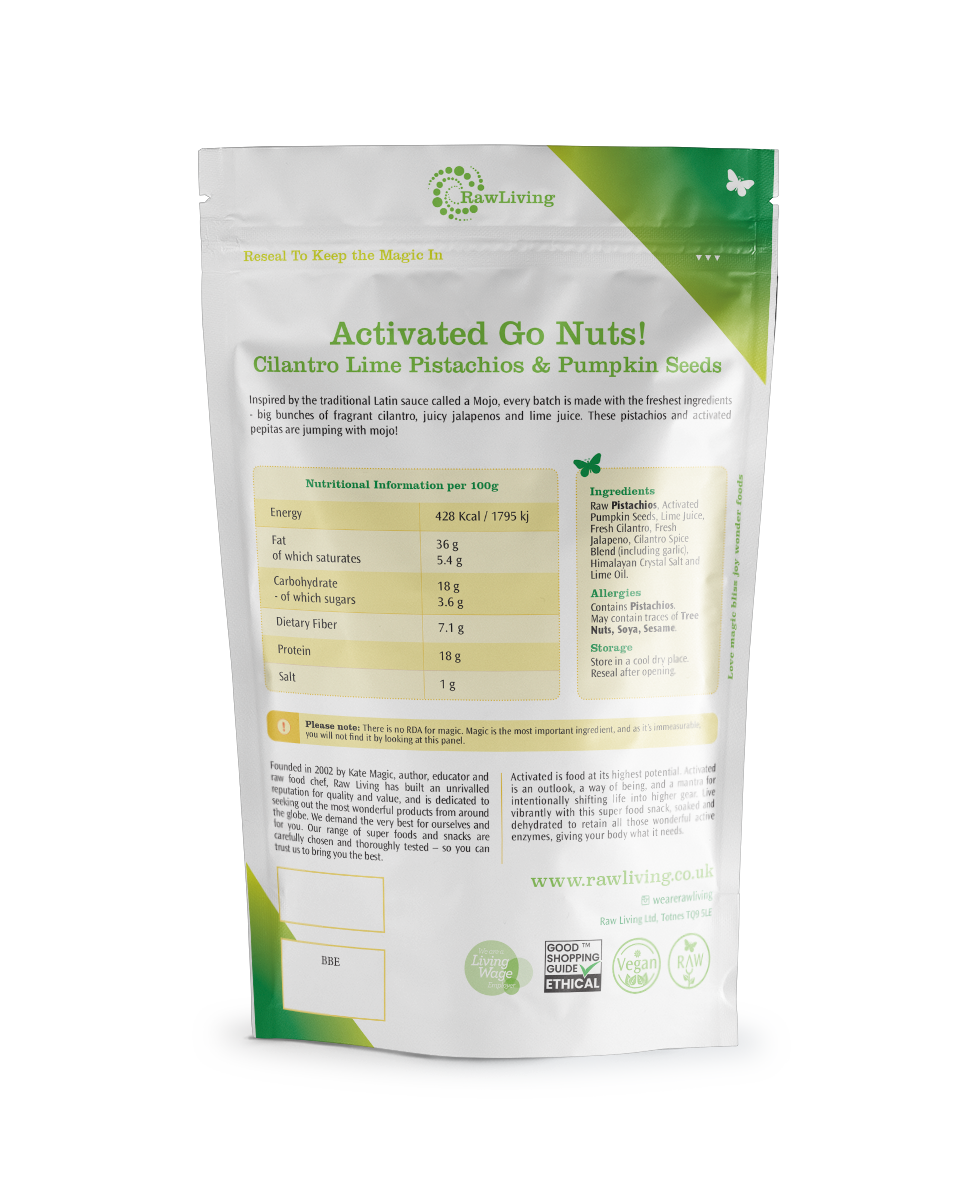 Try all six exciting flavours in our new premium activated nuts range. Thai Curry Cashews & Almonds, Spicy Chipotle Pistachios & Pumpkin Seeds, Sesame Teriyaki Almonds & Cashews, Rosemary Garlic Pistachios & Almonds, Maple Mesquite Walnuts, and Cilantro Lime Pistachios & Pumpkin Seeds, Activated is food at its highest potential. Activated is an outlook, a way of being, and a mantra for intentionally shifting life into higher gear. Live vibrantly with this super food snack, soaked and dehydrated to retain all those wonderful active enzymes, giving your body what it needs. Created with love in the USA by Living Intentions.