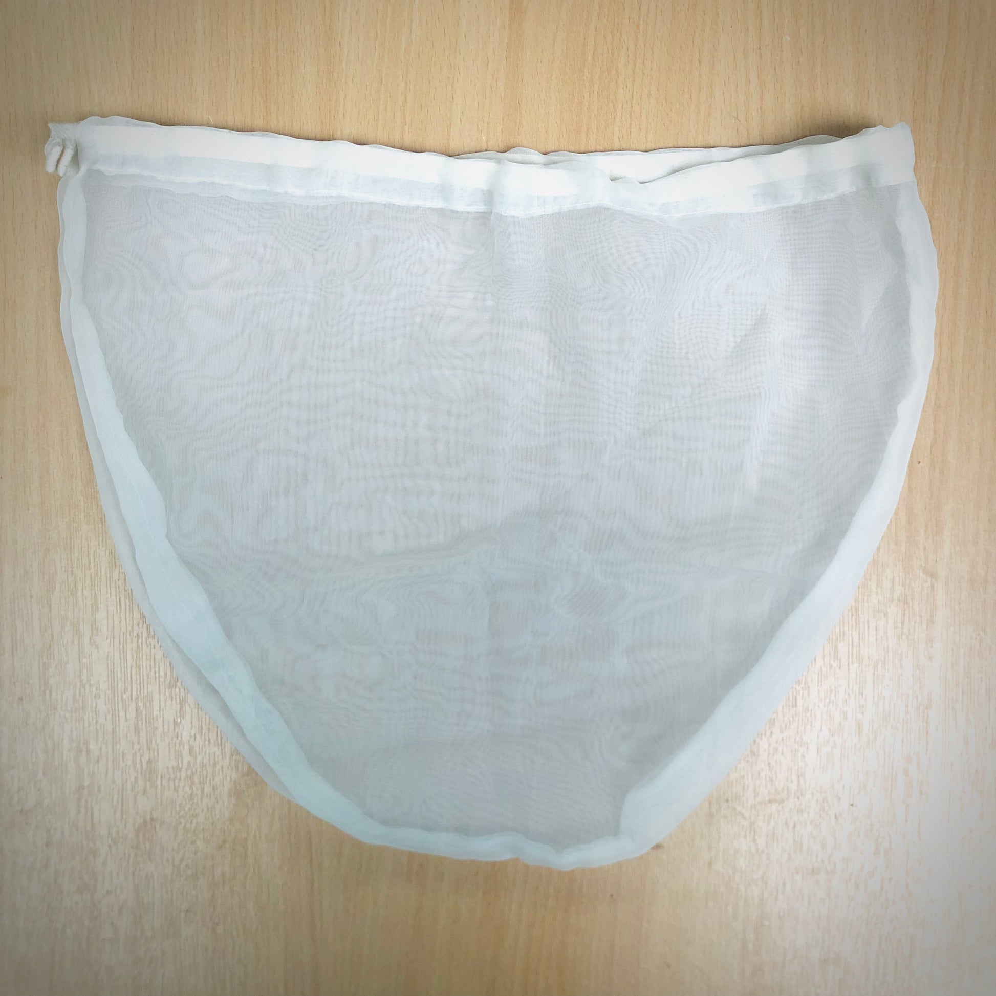 With a wide opening (15"/38cm) and a good depth (13"/33cm), it can easily handle large amounts of food. Its ergonomical design has no annoying corners, but is rounded at the bottom for ease of cleaning. It's made from cotton muslin with a cotton drawstring.