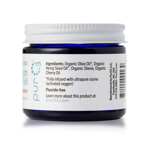 PurO3 Tooth & Gum Support is made from fully ozonated organic olive oil and ozonated organic hemp oil with your choice of flavors. There's no fluoride or extra ingredients. Recently, ozonated olive oil has been recommended by several well known health practitioners as an excellent support for teeth and gums, for plaque removal and for other uses. We combined it with a little ozonated hemp oil to make it even better. You can choose an unflavored version or try it with peppermint, peppermint and Stevia, or cherry and Stevia.
