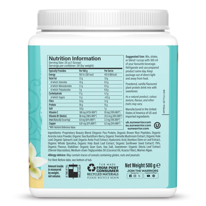 Sun Warrior’s Collagen Building Peptides (Tahitian Vanilla) provide an inside -out approach with a plant-based solution, tailored to help support the body’s inherent collagen production.