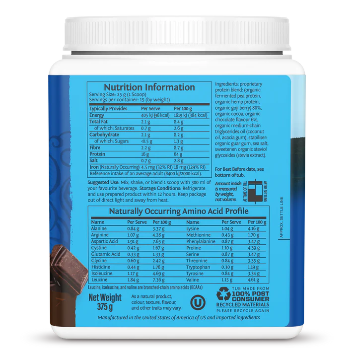 SunWarrior’s Warrior Blend (Chocolate) fuses the synergistic power of several rich protein sources into a one smooth, great-tasting plant-based blend. Fermented yellow peas, goji berries and hemp seeds come together to supply a complete amino acid profile with a substantial amount of BCAAs (branch-chain amino acids). Enhanced with coconut MCTs (medium-chain triglycerides) to fuel your body and active lifestyle. Warrior Blend is a high-performance plant-based protein blend, designed for anyone who wants to amplify their health and fitness.